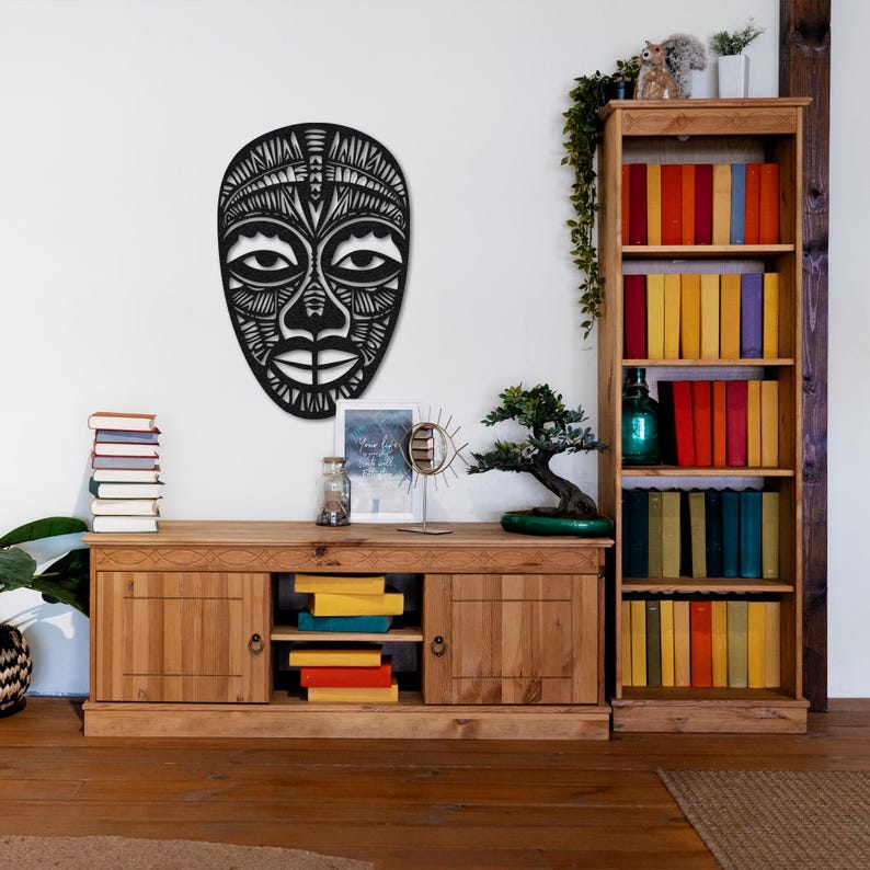 Add cultural depth and artistic warmth to your home with this African Mask Metal Wall Decor, a stunning fusion of tribal heritage and modern design.Specifications: Laser cut from 2 mm matte-coated steel, rustproof, ready to hang.