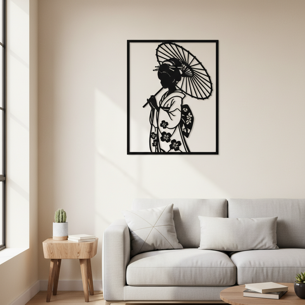 This elegant metal wall art captures the timeless silhouette of a geisha with her traditional hairstyle and flowing kimono. The delicate parasol adds an element of grace and mystery. A sophisticated piece that brings the refined beauty of Japanese culture to your home or business.