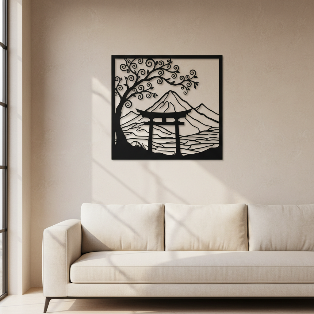 This serene metal wall art depicts a traditional Torii gate set against a backdrop of mountains and cherry blossoms, capturing the tranquil beauty of the Japanese landscape. Ideal for creating a zen atmosphere in your home, meditation space, or office.