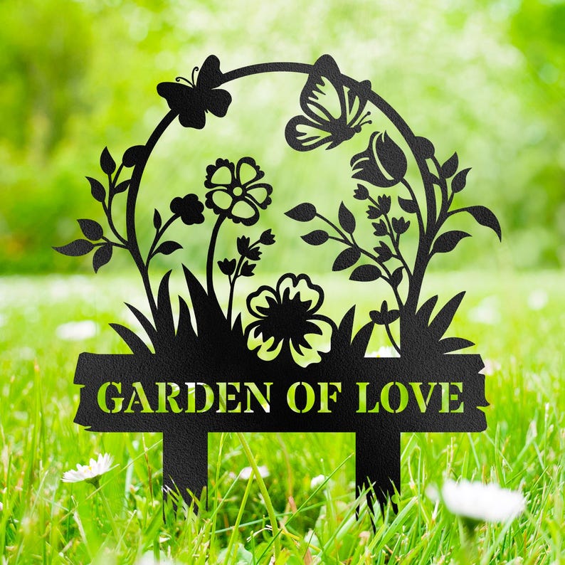 Add elegance to your garden with this Custom Butterfly & Flower Metal Sign, engraved with your name or message.Specifications: 2 mm steel, matte-coated, includes stake, outdoor safe.