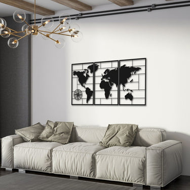 Travel meets artistry in this World Map Compass Metal Wall Art. A stunning multi-piece display for explorers at heart.Specifications: 2 mm powder-coated matte steel, 1 cm (0.4") elevated 3D finish. Comes in 3 panels, ready to hang.